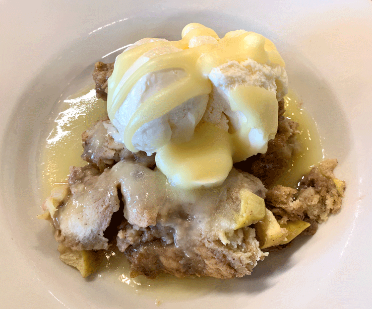 21 December 2019: As an aficionado of bread pudding, my eyes wandered no further on the menu than the bourbon apple pecan bread pudding (a cast iron skillet bread pudding made with French bread, heavy cream, vanilla, brown sugar, bourbon, Granny Smith apples, cinnamon and pecans). It’s a great bread pudding in that it provides a nice balance of sweet, savory and tart flavors. Unlike some bread pudding, it’s not cloying. It might even make it onto Larry McGoldrick’s bread pudding hall of fame and no one knows bread pudding as well as the professor with the perspicacious palate.
