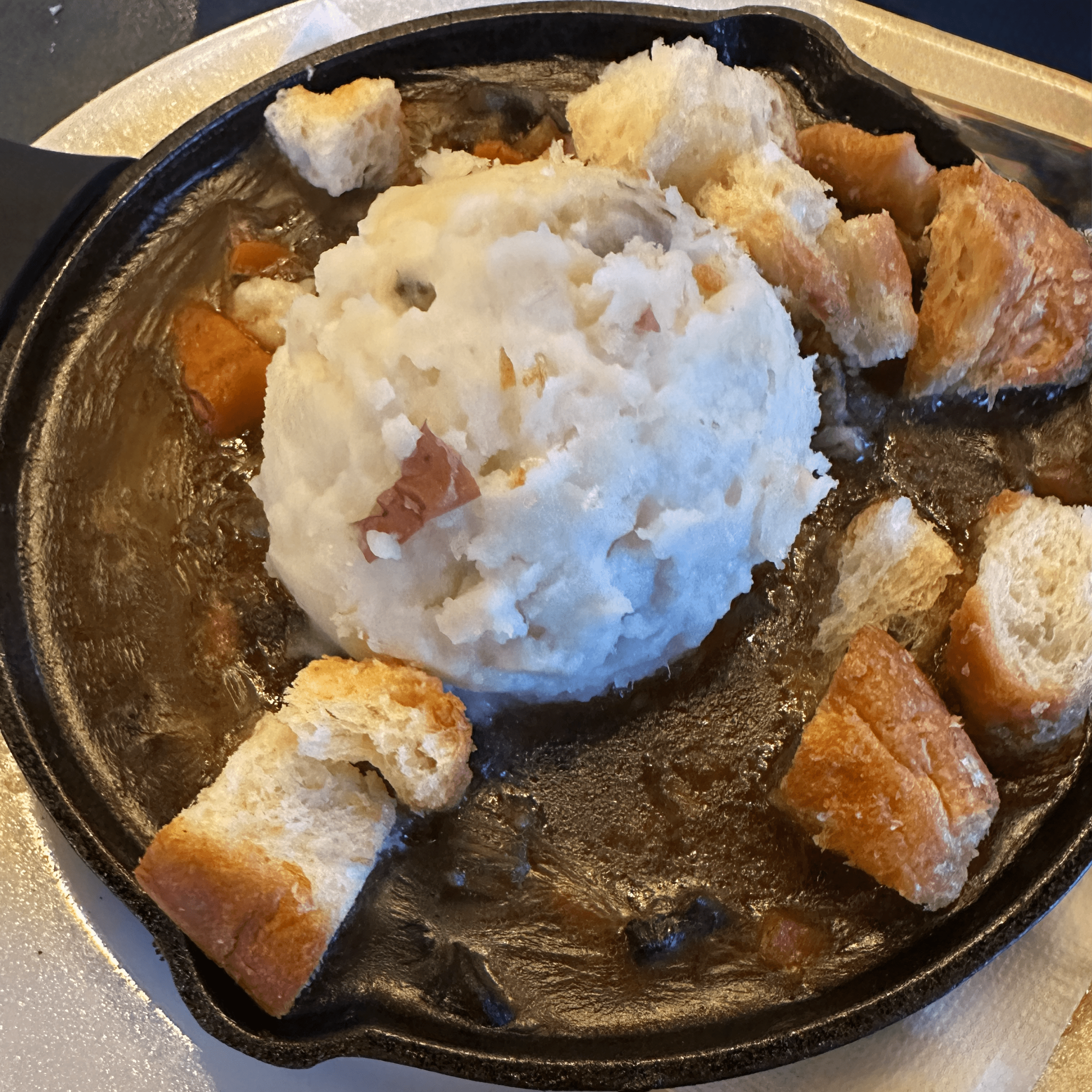 Though empirical data and incontrovertible data don’t exist, it’s almost a given that America’s favorite stew is a classic, old-fashioned beef stew. Prepared well, beef stew is hearty and delicious, showcasing slow-cooked beef with vegetables and a savory gravy-like broth. There are literally hundreds of recipes across the internet for beef stew. Because Dave’s aim is to feed Albuquerque “Midwest comfort food,” it makes great sense that his menu would include stew. Not any ordinary beef stew does Dave serve. It’s Beef Burgundy Skillet Stew (braised beef short ribs, carrots, pearl onions, mushrooms, redskin mashed potatoes, topped with toasted croissant croutons. This treasure of a dish is served with your choice of salad or soup and a green chile Cheddar biscuit. The menu describes this item as “perfect for a fall warm-up.” I couldn’t have said it better myself.
