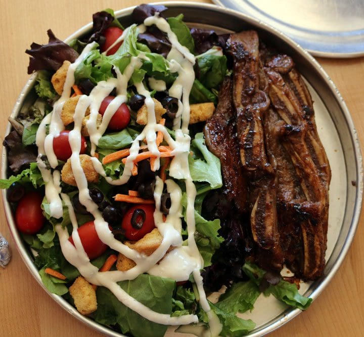 20 June 2018: My friend Sr. Plata has long lamented the absence in Albuquerque restaurants of Flintstonian beef ribs, the type of which were so ubiquitous in his old hometown of Los Angeles. What he’s found more commonly available are Korean-style barbecue ribs, known as “galbi or kalbi” in Korea. As with bulgogi, its meaty brethren, kalbi is marinated and grilled slowly. Kalbi is made from flanken-style short ribs, about eight-inches in length, each strip containing at least two rib bones. Gnawing around those bones and extricating the sweet meat is a journey into deliciousness. There really isn’t much meat on each rib, but each meaty morsel if delicious. Though normally served with rice and pico de gallo, Sr. Plata asked for a side salad instead.