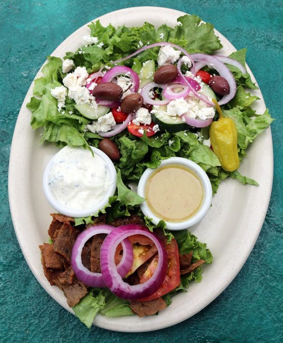 9 June 2018: For my Kim, sometimes only a gyro (always double meat) will do, never mind all the exotic offerings on the menu. Available with your choice of chicken or the beef and lamb amalgam typically found on gyros, the double-meat gyros are served with a large Greek salad, several wedges of pita (if you don’t want your gyros “sandwich-style”), and ramekins of tzatziki and Greek dressing. The Greek salad (or at least the large lettuce leafs) dominates the plate though there’s never enough feta cheese or Kalamata olives to suit us. Don’t spare the Greek dressing; it’s the best we’ve had with sweet, tangy and savory notes melding together beautifully. Both the chicken and the beef-lamb are fresh and delicious with a lightly seasoned profile.