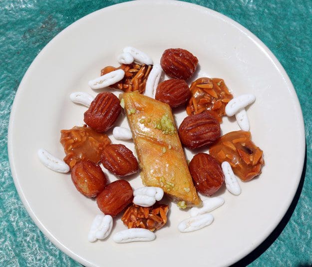 9 June 2018: Also among the dessert offerings are baklava–both the traditional Greek baklava and Persian baklava which is made with rosewater, but not with phyllo dough. The Persian baklava is topped with ground pistachios and isn’t nearly as sweet as its honey-flavored Greek counterpart. Order it as part of the Persian Dessert plate and in addition to the Persian baklava, you’ll enjoy sohan asali (honey, saffron and almond “caramels”), bamieh (Persian “doughnuts” flavored with rose water and saffron) and a terrific brittle. It’s a great way to introduce your taste buds to some of the most unique and tasty desserts in town.