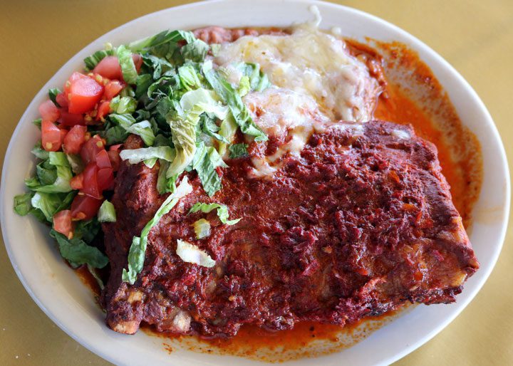 Despite all the red and green chile specialties, the menu item beckoning most seductively were the red chile pork ribs which the menu labeled as a “local favorite.” For once in my life, it didn’t matter that the red chile was tinged with cumin, that foul despoiler of New Mexico’s chile. I craved meaty, tender, moist and delicious pork ribs and that’s exactly what Tortilla Flats delivered: a half-rack with eight bones covered in pork and slathered in a sweet red chile sauce served with a side of smashed pinto beans under a blanket of molten cheese. Despite my aversion to cumin, these ribs were so good no “choking them down” was necessary. We extricated tender tendrils of moist pork from each bone, pausing only to wipe our chile-stained fingers.
