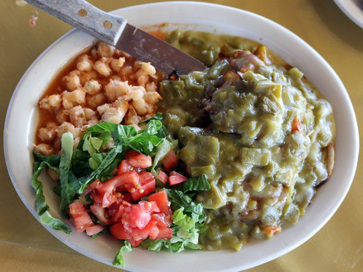 My Kim also ordered an unconventional New Mexican dish, the green chile chop (an eight-ounce, bone-in, lean, center-cut pork chop smothered with green chile and topped with grilled tomatoes and onions). The pork chop was easily half an inch thick, grilled and seasoned very well. Still it was just a pork chop, not elevated until covered in a green chile with a sweet roasted flavor which reminds you that chile is actually a fruit. There was plenty of it, too. Instead of pinto or black beans, Kim asked for the posole, always a reliable choice.