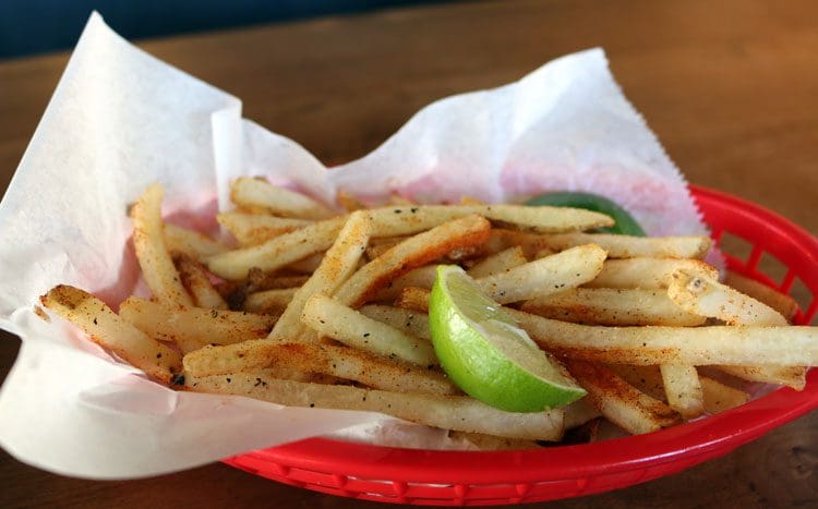 14 September 2018: Mexican restaurants, even the palaterias which specialize in frozen treats, have long used a red chile and lime pairing to enhance the flavor of many foods. If you’ve ever had an elote at El Cotorro or a Mexican popsicle, you know of what I speak. The pairing of red chile (a dusting of red chile from Chimayo) and lime (two wedges) with French fries was a new one for me. Considering my affection for chips (fries) with malt vinegar, it would make sense that the citrus tang of lime would appeal to me. It did! The more lime you squeeze onto the red chile dusted fries, the messier the mix…and the more delicious.