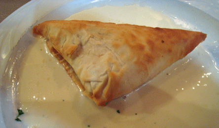 You’ll want that bread replenished frequently because you’ll use it to savor each and every drop of the white wine sauce accompanying the goat cheese phyllo appetizer featuring a sharp, sweet Vermont goat cheese and red peppers wrapped in phyllo. Puncture the layers of delicate phyllo with your fork and you’ll be rewarded with light oozing from one of the smoothest goat cheeses ever, a medley of sweet and sharp flavors complementing each other. The red peppers are a subtle addition, used in moderation so as not to overwhelm the other ingredients.