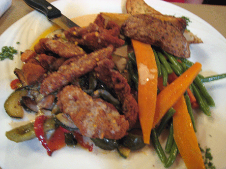 During our second visit she surprised me even more by ordering a Thai inspired crispy duck floating atop a peanut sauce along with julienned vegetables (green beans, carrots, zucchini and red pepper). The crispy duck is moist and delicious, each of several breaded fingers redolent with flavor. The peanut sauce has a slightly sweet, ever so lightly piquant flavor that makes the duck sing. The vegetables are perfectly prepared. The carrots are in the French style, buttery with more than a hint of ripe sweetness.