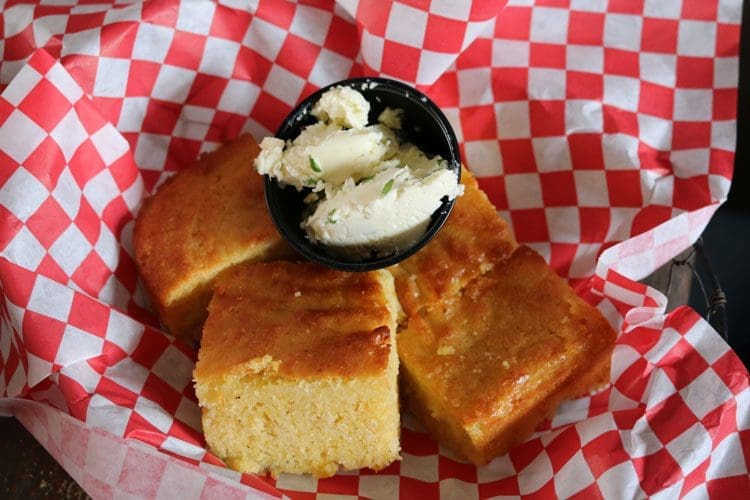 Mark Twain once said “Perhaps no bread is as good as good as Southern cornbread.” He also said some rather unsavory things about Northerners attempting to make corn bread, but that’s a topic for another day. It’s a topic my New York snowed-in friend Becky Mercuri and I discuss often. More than anyone I know, Becky would have enjoyed the cornbread at Lucy’s. Studded with sweet corn niblets, this cornbread is dense, moist, sweet and absolutely delicious. It’s even better when you slather on the tequila butter with its garlicky, oniony notes. How we wished “butter shots” were good for you.