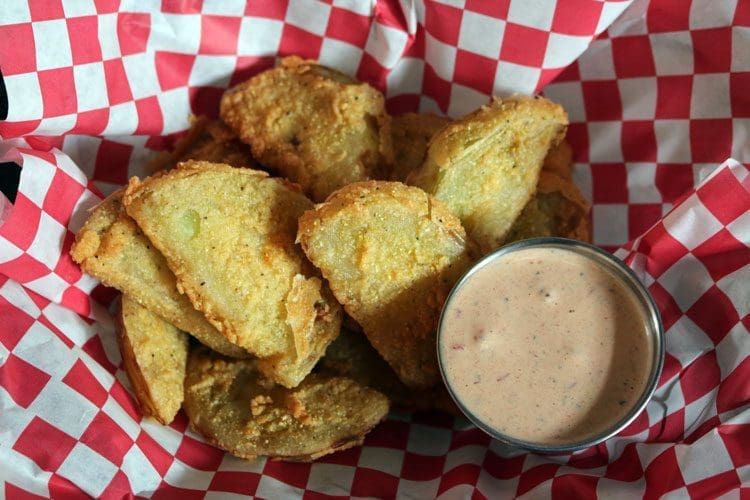 If you prefer to give fried chicken the bird, you’ll find many other options from which to choose. Wood-fire-grilled oysters are a very popular draw and to a lesser extent, so are mountain oysters (look it up). Frankly, we were quite surprised at the diversity of the menu. It’s got something for everyone, including vegetarians. Carnivores and vegetarians alike will make quick work of Lucy’s fried green tomatoes (marinated in Lucy’s “secret buttermilk blend” and deep fried, with chipotle ranch). Sliced to about a quarter-inch thickness, the tomatoes are sheathed in a light golden batter and are fried only long enough for the batter to adhere. That means the green tomatoes taste like green tomatoes–firm, not mushy. The accompanying chipotle ranch is better than any remoulade we’ve had with fried green tomatoes. It’s got delightful smokiness and heat.