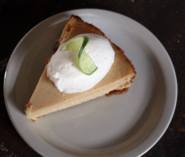 Lucy’s doesn’t have a dessert menu. It’s got a pie menu. Served by the slice are a number of tempting pies, including a lime pie (lime custard with a graham cracker crust) with no pretensions of being a key lime pie. It doesn’t matter. This is an excellent pie. The lime custard is dense and delicate with a pronounced, though not lip-pursing, citrusy tang. The graham cracker crust is light and fine, playing a supporting role to accentuate the lime flavor.