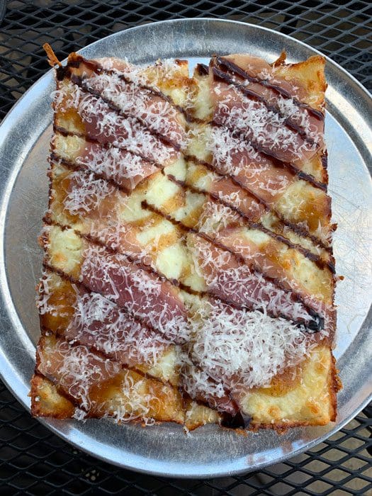 Detroit-style pizza is traditionally prepared in square blue steel pans originally used to hold nuts and bolts in the factories so prevalent in the Motor City’s industrial heritage. (Our server even brought one of those pans to our table to appease this skeptic.) Those pans are well oiled before the dough–about three-quarters to an inch thick–is added. The dough is baked lightly before toppings are added then it’s baked a second time. This results in a thick, chewy and airy crust with caramelized, well-done edges and a crispy bottom. There is almost no char. Because it’s baked into a rectangular shape, every piece is a corner slice and because the crust is so crispy, it won’t get soggy. Here’s betting you’ll eat every bit of that crust.