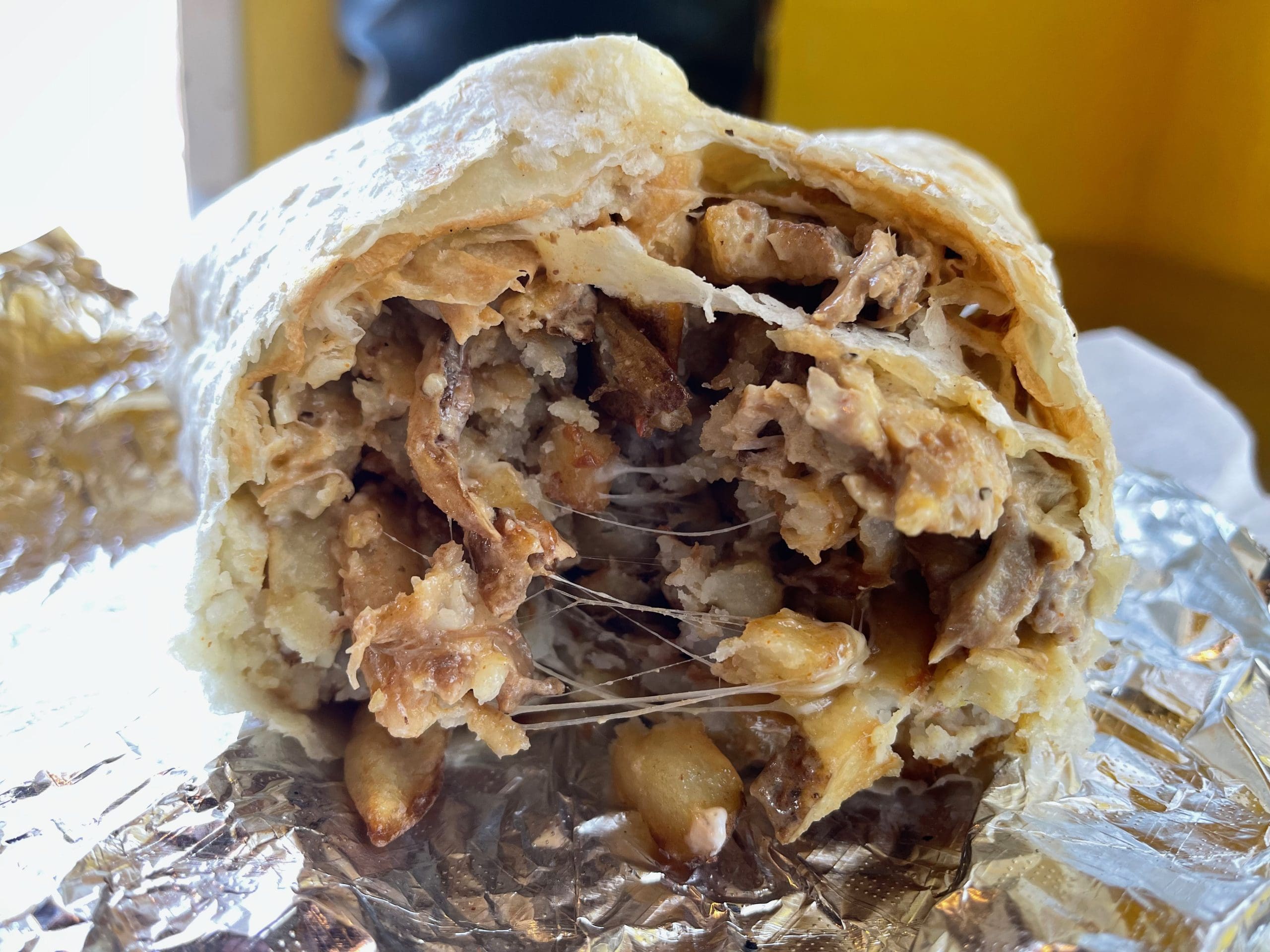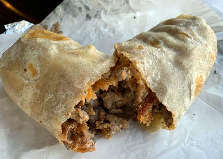 6 December 2018: At Last Call, the burrito’s tortilla is roughly the size of a hot air balloon canopy overstuffed with half a steer’s worth of carne asada cut into small cubes and a fat fistful of French fries. Seriously, this is one behemoth burrito that’s got to weigh in at nearly two pounds. No ordinary fries grace this burrito’s insides. They’re extra crispy, skin-on beauties that provide a terrific textural contrast to the tender carne. Monterey and Cheddar, two mild cheeses, blend together to provide a nice foil for the fiery combination of chipotle aioli and chile de arbol. These sauces not only impart piquancy, they make the burrito a delightfully sloppy, multi-napkin affair.