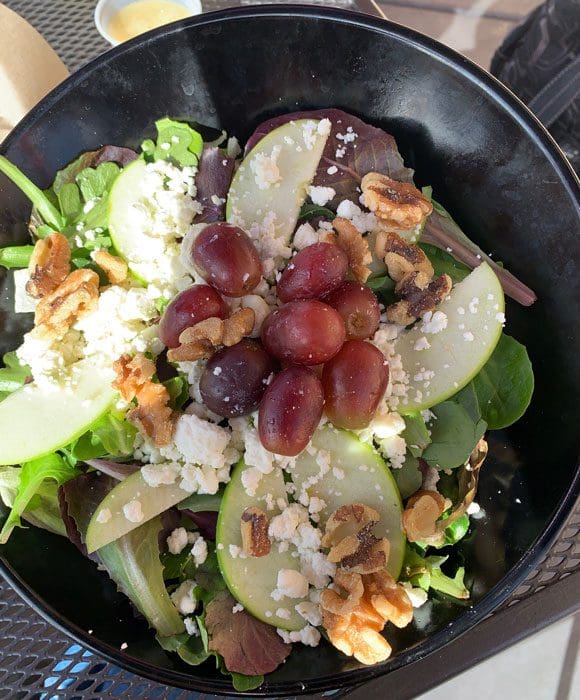 Instead of French fries or onion strings, we opted for the Apple Orchard salad (mixed greens, tart Granny Smith apple slices, goat cheese crumbles, grapes, walnuts, green apple vinaigrette), one of three fresh salads on the menu. As expected, the prominent notes on this artisan salad were tartness from the apple slices and green apple vinaigrette and savory richness from the walnuts and goat cheese crumbles. A few more goat cheese crumbles would counterbalance the not quite lip-pursing tartness of the salad.