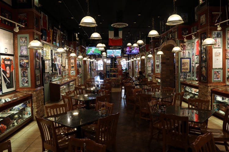 To call Sammy C’s a mere sports bars is akin to declaring the Mona Lisa just another painting. It’s eleven-thousand square-feet of dining areas, pub, billiard room, bandstand, dance floor and even a coffee bar in which Starbucks is brewed. No matter where you turn at this pantheon of sports and rock, you’ll experience sensory bombardment with signed jerseys under spotlighted glass and signed guitars attached to the wall. There are some 5,000 pieces of sports and music memorabilia, most autographed. Sports fans enjoy some thirty 42 to 60-inch flat screens in high definition as well as a 90-inch high definition projector screen. In many ways the vast collection of memorabilia reminds me of a smaller version of the National Basketball Association Hall of Fame in Springfield, Massachusetts.