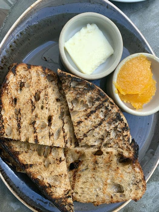 We got excellent recommendations from Levy, including the proper pronunciation for levain bread (it’s not pronounced like Elton John’s song Levon as I’d told my Kim). Levain, he explained, is a bread starter, a leavening agent used in place of yeast to make dough rise. As with all starters, once it’s mixed into bread dough, a portion of the bread dough can be removed, put back in the starter receptacle, and remixed with flour and water to maintain the starter so it is readily available for the next batch of bread. Forget the scientific properties of levain bread. All you knead…er, need to know is that it’s delicious. Workshop serves mesquite grilled slices with butter and an apricot compote that’ll blow your mind. This is the type of toast worth getting up for.