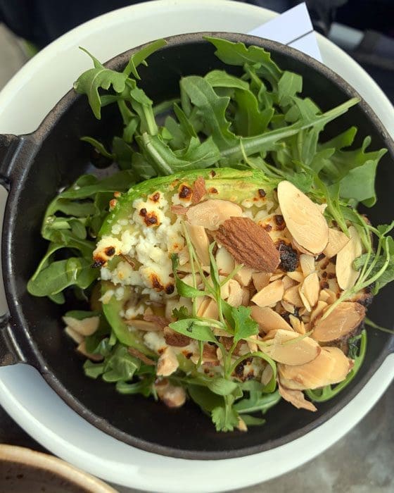 Real Simple, an “online go-to site for those who are looking to make life easier” calls avocados a “breakfast superhero,” explaining “packed with healthy fats and fiber, this delicious fruit is a healthy breakfast choice dressed up in an irresistibly creamy package.” Sounds good to me. So did Workshop Kitchen’s half avocado side dish baked with Drake (and I had thought they only made coffee cakes) farm’s goat cheese, drizzled with honey and chopped almonds. The earthy, tart goat cheese filled the cavity where the avocado pit once was with more spread atop the lusciously rich, creamy, buttery avocado. Shaved onions (perhaps Marcona) offered a textural contrast as did the arugula and micro greens. The honey was a sweet counterbalance to the other flavors. If avocados are a breakfast superhero, their secret identities should be immediately and widely divulged.