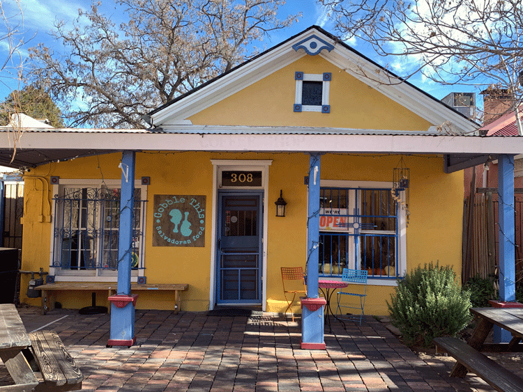 The resounding popularity of his food truck convinced Nestor that he could translate that success into a brick-and-mortar operation. In March, 2018, a scant three years after deploying his food truck, he launched Gobble This in an Old Town space on San Felipe previously occupied by a Greek deli and long before that, as a brothel. The restaurant’s exterior is awash in color reminiscent of New Mexico’s sun and sky—yellow gourd walls with Taos blue pillars. Interior walls are more muted, but festooned with colorful art. Uneven red brick flooring lends to the vintage charm as do Salvadoran touches Nestor will proudly point out.