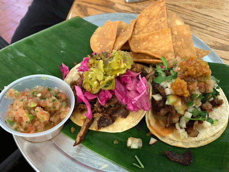 Among the tacos showcased is the Pavo (diced cucumber and radish, mango-pineapple-habanero salsa), one of three street tacos on the menu. The Pavo is constructed with the same mole-infused pulled turkey from which the El Chumpe sandwich is made. Where the differences between sandwich and taco are most pronounced is in the bolillo’s ability to better contain its contents. As with the sandwich, the taco is overfilled—literally spilling out beyond the two soft corn tortillas. Unless you can open your mouth as wide as Guy Fieri, you’ll probably have to eat about half the turkey with a fork before you can enjoy it as a handheld taco. The Pavo is aa candidate for best taco in the city honors.