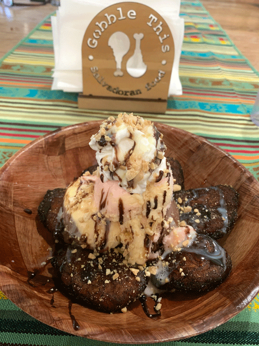 25 January 2019: Gobble This has a very limited dessert menu. One of the most interesting features ripe plantains fried so that they caramelize around the edges and their sweetness is more concentrated. These “tostones” are topped with Neapolitan ice cream (chocolate, strawberry and vanilla) and drizzled with dulce de leche and red chile agave. It’s a memorable dessert (ironically one whose name I don’t remember).