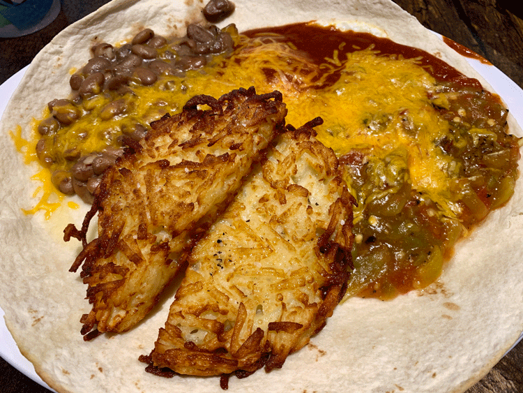 Shirley and I both had excellent breakfast burritos this morning. Mine was chorizo smothered with red.