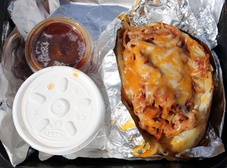 My Kim, who’s not quite the traditionalist I am about Texas barbecue, eschewed sausage and other beef-based-barbecue for a loaded baked potato (baked tater with butter, cheese, sour cream and pulled pork). As loaded baked potatoes go, this was a very good one, but for me, not one worth passing up Kreuz sausage. About the size of a Nerf football, it’s as loaded as described, but you’re still likely to find yourself plucking out the pulled pork then focusing on the more typical baked potato fixings.