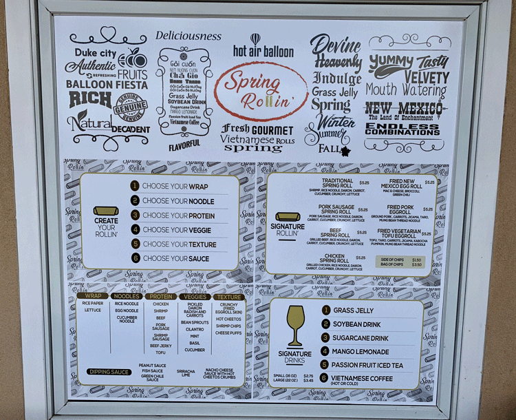 Evocative of the new growth associated with spring, an eatery dedicated to the spring roll opened its doors in March, 2019 at the Riverside Plaza in Albuquerque’s burgeoning west side. Fittingly named Spring Rollin’, the Lilliputian lair is owned and operated by the great folks who’ve wowed the metropolitan area with The Paleta Bar. It’s also fitting that the city’s second instantiation of the popular paleteria sits immediately next door the Spring Rollin’. Among its other neighbors at the Riverside Plaza are Hannah & Nates, Sakura Sushi & Grill and The Last Call. With the 2021 closure of the beloved California Pastrami, its vacancy was short-lived when Spring Rollin’ launched its second Albuquerque location at that location, this space much larger. A third location can be found in Colorado Springs.