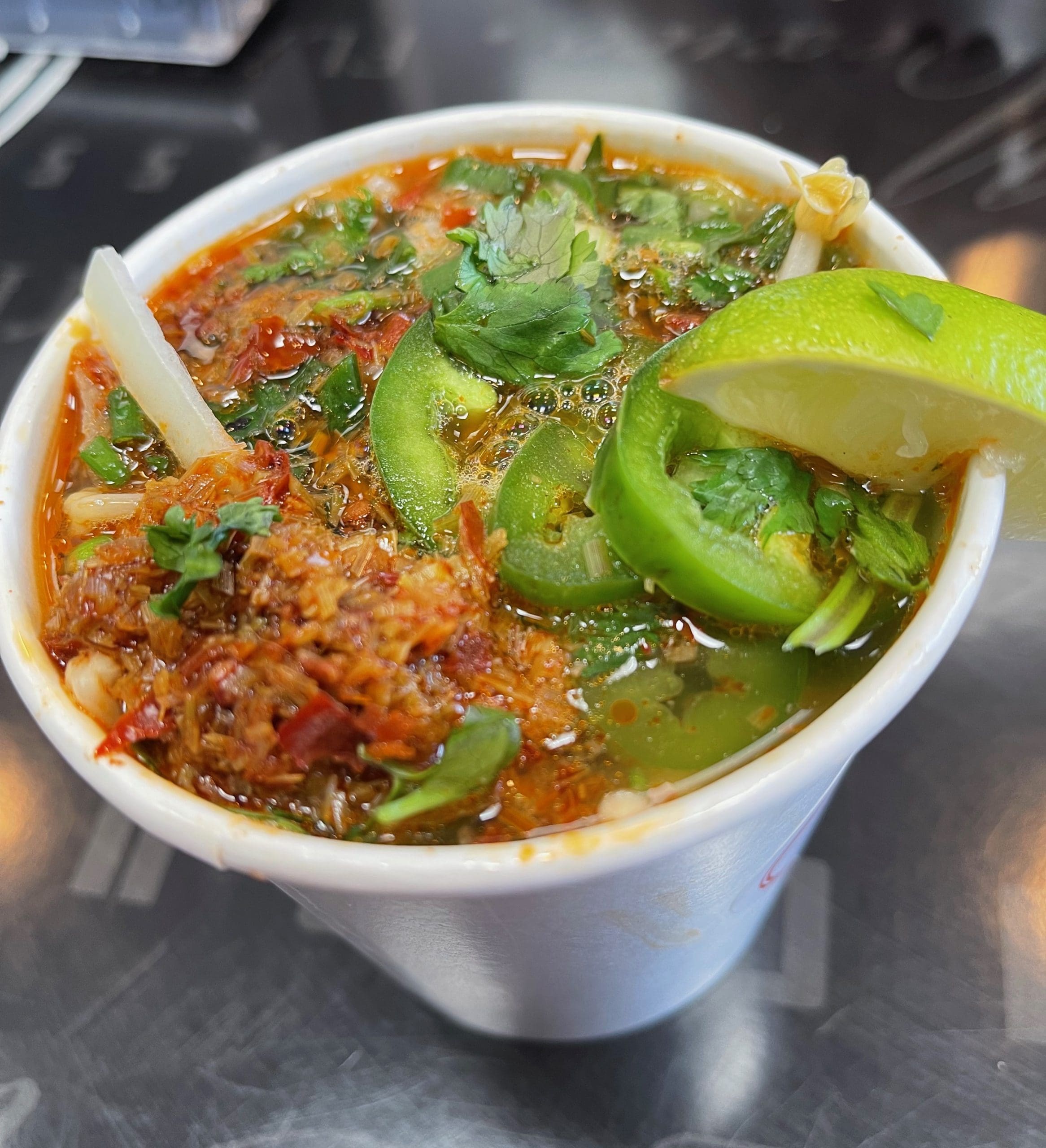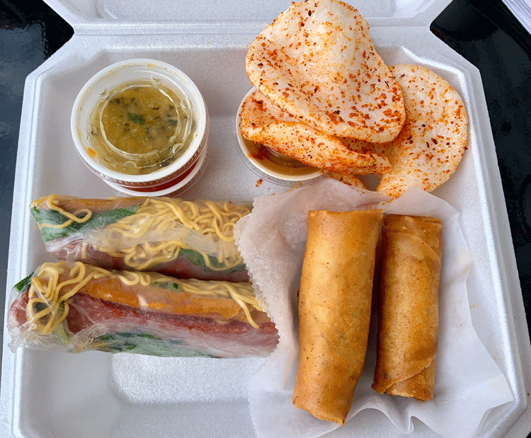 21 April 2023 (Cottonwood): Perhaps the best bargain at Spring Rollin’ is the Triple Combo (two egg rolls, two spring rolls and pho). Technically spicy lemongrass soup isn’t a pho though it is a beef noodle soup. It’s the Vietnamese soup with the most personality (translation: it’s spicy and piquant). My cup (above) overflowed with ingredients, including several jalapeños on top. Below the surface you’ll find smoked brisket and beef meatballs. More than any spicy lemongrass soup I’ve ever had (and I’ve had dozens), Spring Rollin’s has the very best smoked brisket. It’s smoked so well that it permeates the broth, infusing it with an almost “barbecue” quality. The beef meatballs inherited some of that smokiness, too.