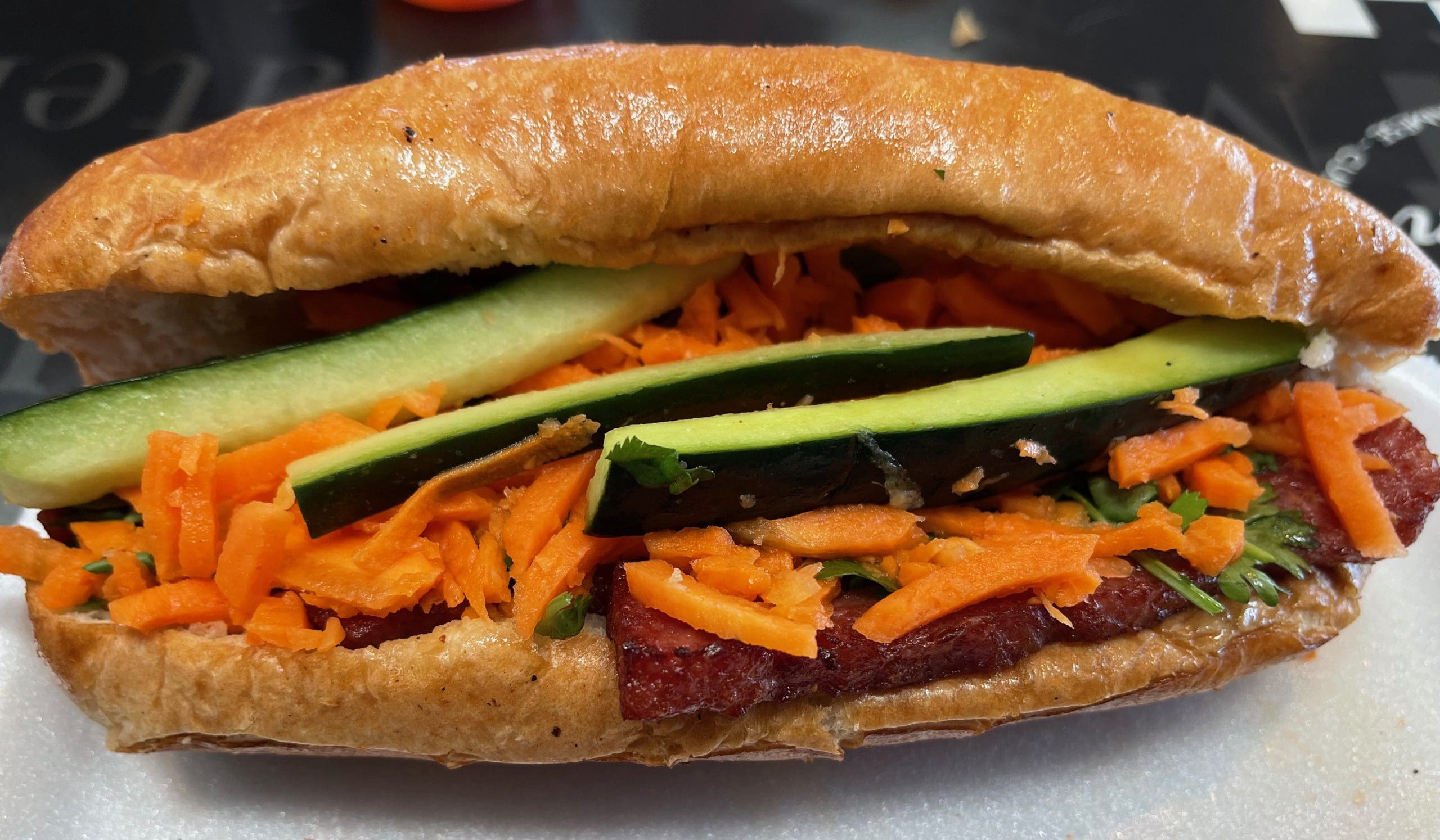 21 April 2023 (Cottonwood): My Kim rarely passes up banh mi, the delightful Vietnamese sandwich. It’s available at Spring Rollin’ with beef, chicken, tofu and pork sausage (her choice). The sandwich is brimming with fresh ingredients, particularly with veggies (julienne carrots, cucumber, parsley) and is served with the de rigueur fish sauce. The baguette is soft and chewy yet formidable enough to contain all the fresh, moist ingredients of the banh mi. As with all great banh mi, the focus is not necessarily on the protein you select, but on the coalescence of flavors and textures. Done well, you won’t even mind that the protein isn’t necessarily the star of the show. Spring Rollin’s Banh Mi is done well!