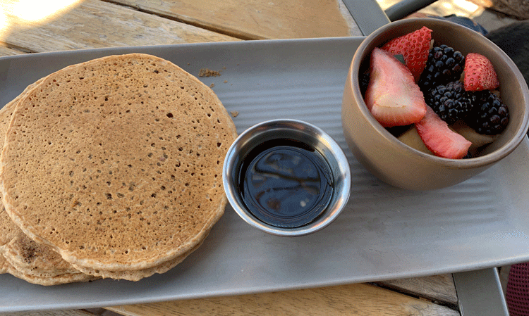 “Spelt? Does that mean the chef was clumsy? It’s “spelt” which is spelled “s-p-e-l-t” not spilled which is spelled s-p-i-l-l-e-d. Oh, never mind! Spelt is a type of grain closely related to wheat and it’s good for you. Sweetwater’s smelt is fresh ground and organic. I guarantee you won’t be able to tell much difference from a textural perspective between Sweetwater’s orange cardamom smelt pancakes and the Bisquick pancakes you make at home. Sadly, we didn’t discern much cardamom or orange. The one difference-maker was the real syrup which is oh so much better and healthier than corn syrup.