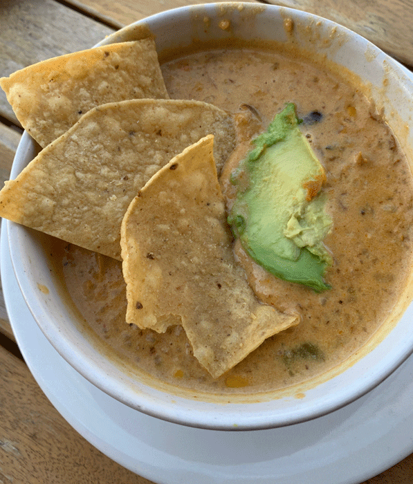 “Where’s the cheese?” You’ve got a point there, Sky. Cheese does make everything else taste better, but Sweetwater’s turkey tortilla soup (turkey, tomato, black beans, corn and cream, topped with avocado and tortilla chips) is a real stand-out even without cheese. This is the quintessential turkey tortilla soup and it’s served hot, not warm. Every element on this soup blends perfectly with every other element. It’s thicker than most tortilla soups you’ll find in New Mexico and the chips are whole, not crumbled onto the soup. There’s turkey in almost every bite. It’s a soul-warming, comforting bowl of deliciousness.