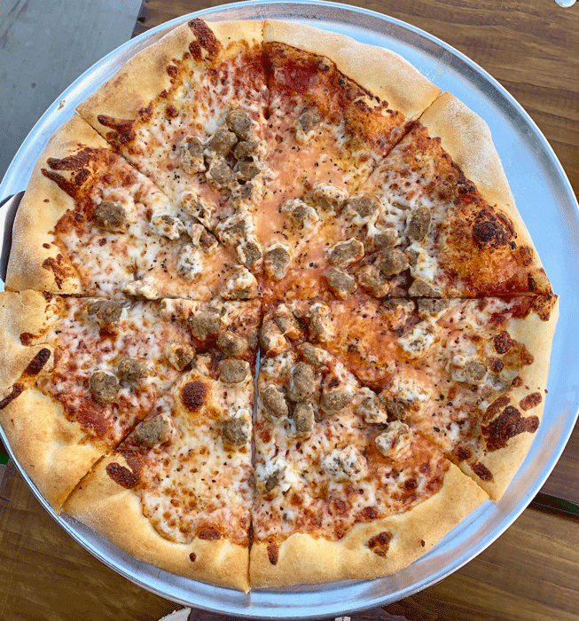 20 April 2019: My Kim’s inaugural pizza artistry at Restoration Pizza was a build-your-own creation starting with a traditional crust canvas topped with both red sauce and an olive oil base with garlic and Italian seasonings (I’m still trying to figure that out), sausage and mozzarella. It’s a nice pizza, but our druthers would have been for more sauce and less cornicione (an Italian term for the “lip” or puffy outer edge of the pizza). This is a classic thin-and-crispy pie and like most pies of that type, is prone to dryness. A plentiful coverage of sausage helps.