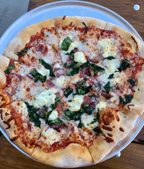 20 April 2019: My pizza, the La Luz (red sauce, mozzarella, thick-cut smoked bacon, red onions, spinach and ricotta) came from the gourmet signature pizza menu. As with my Kim’s build-your-own pie, a bit more sauce covering more of the cornicione was our sole complaint and that’s more a matter of personal preference than it is an indictment. There is much to like about this pizza, particularly the thin and crispy crust and the thick-cut bacon (though can you possibly ever have enough bacon). The pairing of ricotta and spinach is popular across several Italian dishes and for good reason. It’s one of those pairings in which two ingredients just seem tailor-made for each other.