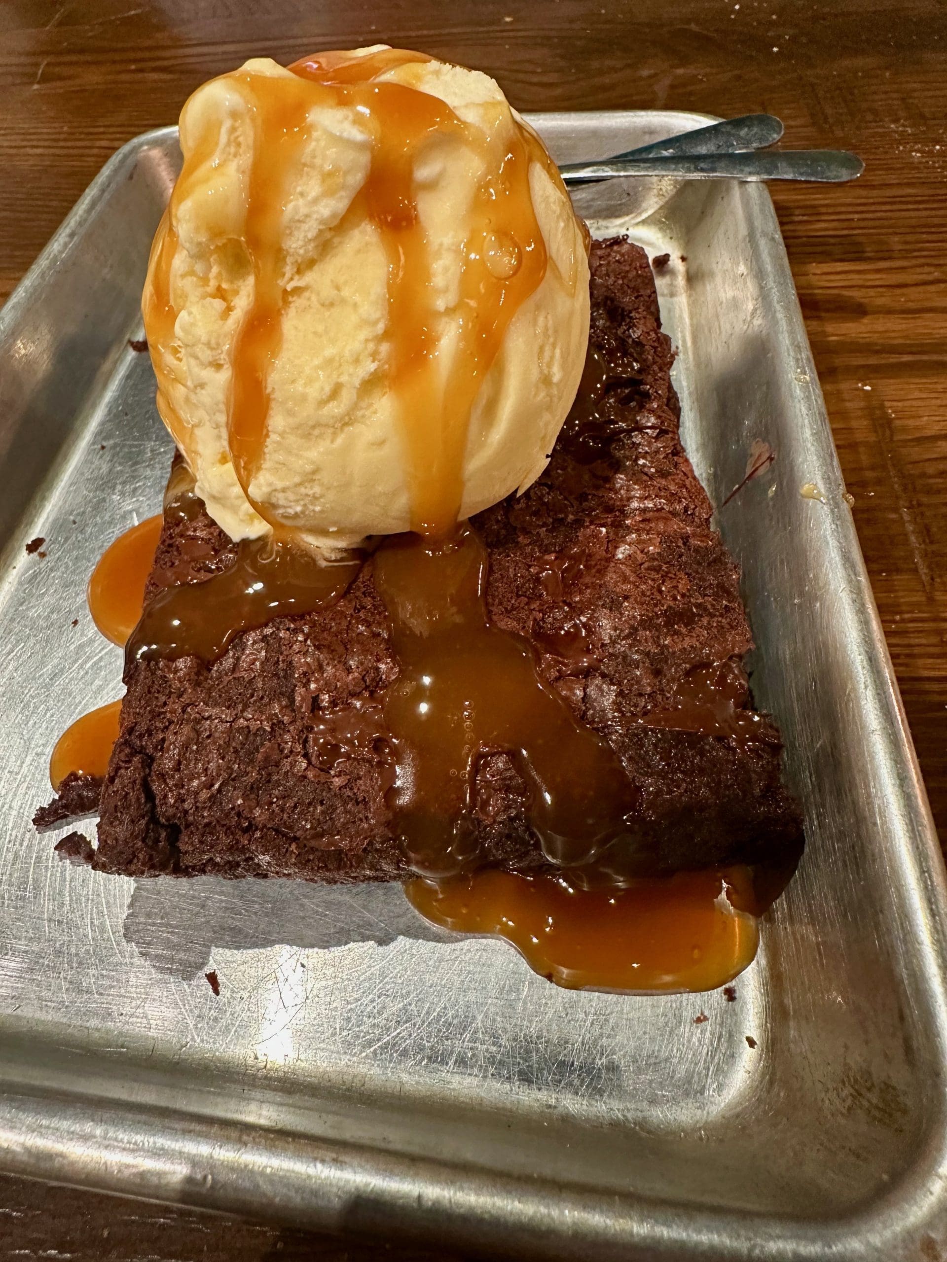 28 February 2024: Restoration Pizza offers five desserts including a ten-inch apple crisp pizza made on Restoration’s signature crust. More a traditionalist than I am, my Kim had an old-fashioned brownie served with ice cream and a caramel drizzle. Though I tend to eschew desserts that are overly sweet, this brownie is not in that category. It’s got a good, strong chocolate flavor without the residual cloying nature of some brownies. The ice cream with caramel were likely too sweet for me.