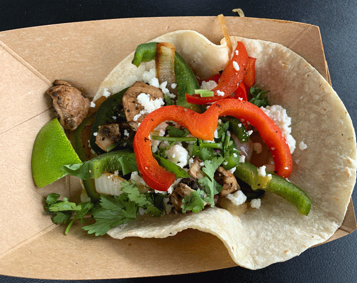 According to Mexican Food Journal, rajas is a Spanish term which literally translates to “strips” or “slices.” Paramours of the poblano throughout Mexico, however, reserve the term for roasted poblano chile strips. Rusty Taco’s rajas taco features grilled poblanos, mushrooms, onions and red peppers topped with queso fresco and cilantro. It’s an excellent taco in which all the veggies save for the mushrooms are roasted to an al dente consistency. The queso fresco is a light touch which complements the veggies nicely while the cilantro adds bright, breezy notes.