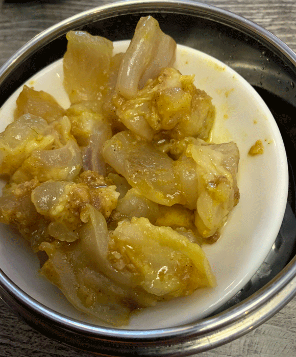 When I order a dish such as curry beef tendon, it’s about a fifty-fifty proposition as to whether or not my Kim will like it. Sometimes it’s the flavor of one of my “strange” dishes she finds off-putting. Sometimes, as in the case of the curry beef tendon, it’s the texture. While my preference would be for her to enjoy such delicacies with alacrity, when she doesn’t enjoy a dish it just means more for me. When I ordered it, our server warned me about the texture (obviously not realizing I was Asian in one of my previous lives). Not everyone will enjoy this dish, but if you aren’t scared off by rubbery, gelatinous foods, you should like this…a lot.