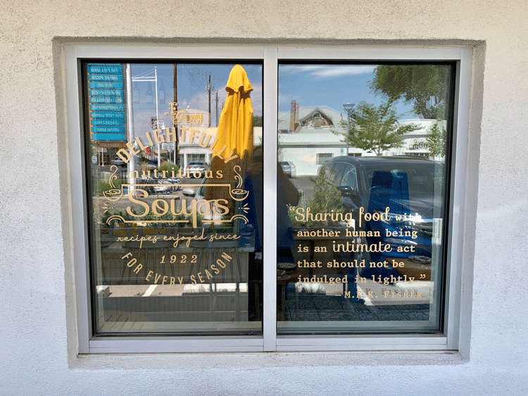 The lyrics to the “Godfather of Soul’s” signature song aren’t etched on the windows or door of The Feel Good, but several other thematic aphorism are. There’s Virginia Wolf’s quote, “One cannot think well, love well, sleep well, if one has not dined well.” M.F.K. Fisher’s “Sharing food with another human being is an ultimate act that should not be indulged in lightly” is etched on the door while Alan D. Wolfelt’s sage “Food is symbolic of love when words are inadequate” occupies another window. Maybe because it’s a shorter quote, James Beard’s “Food is our common ground. A universal experience.” occupies a small window.