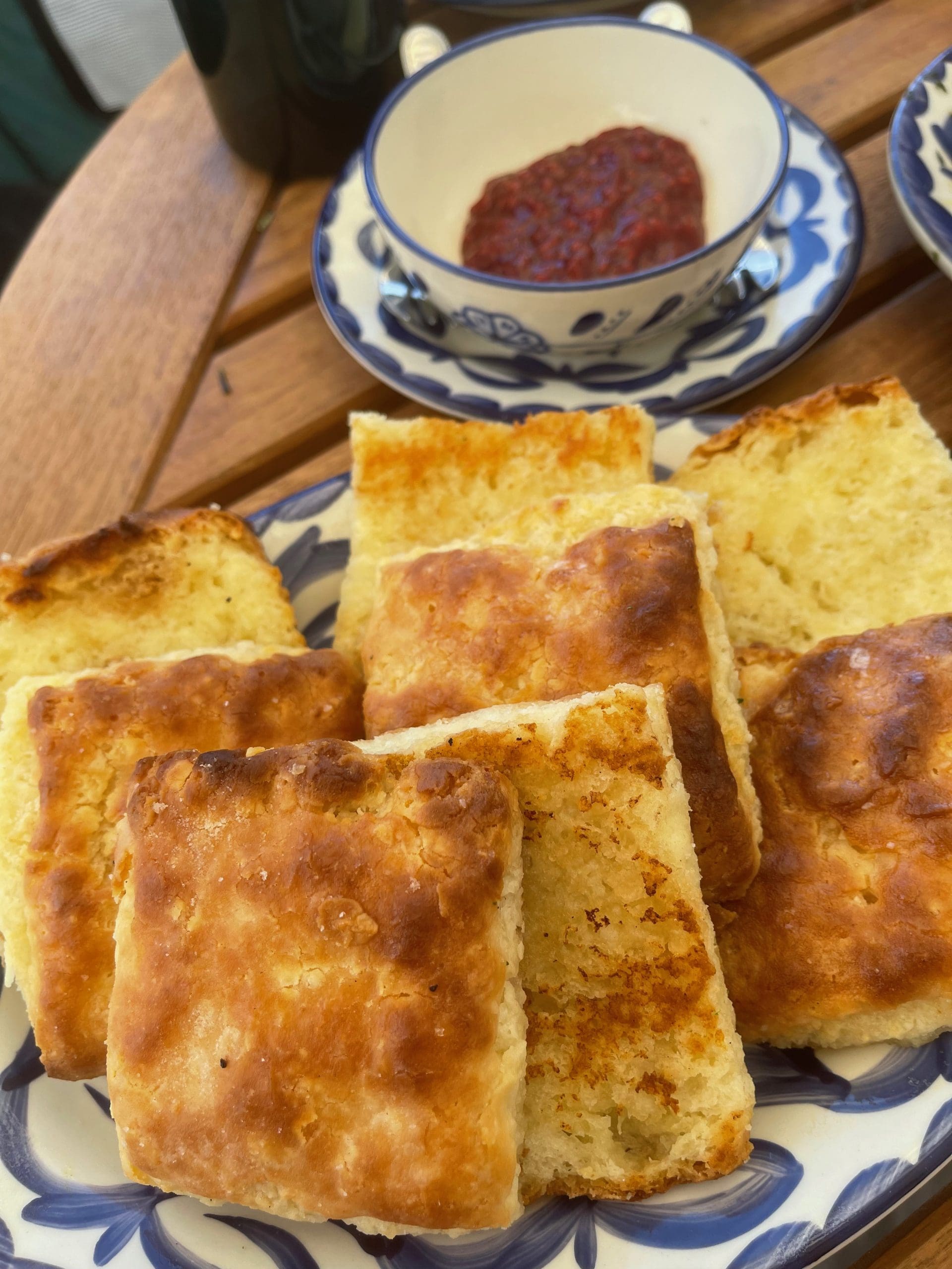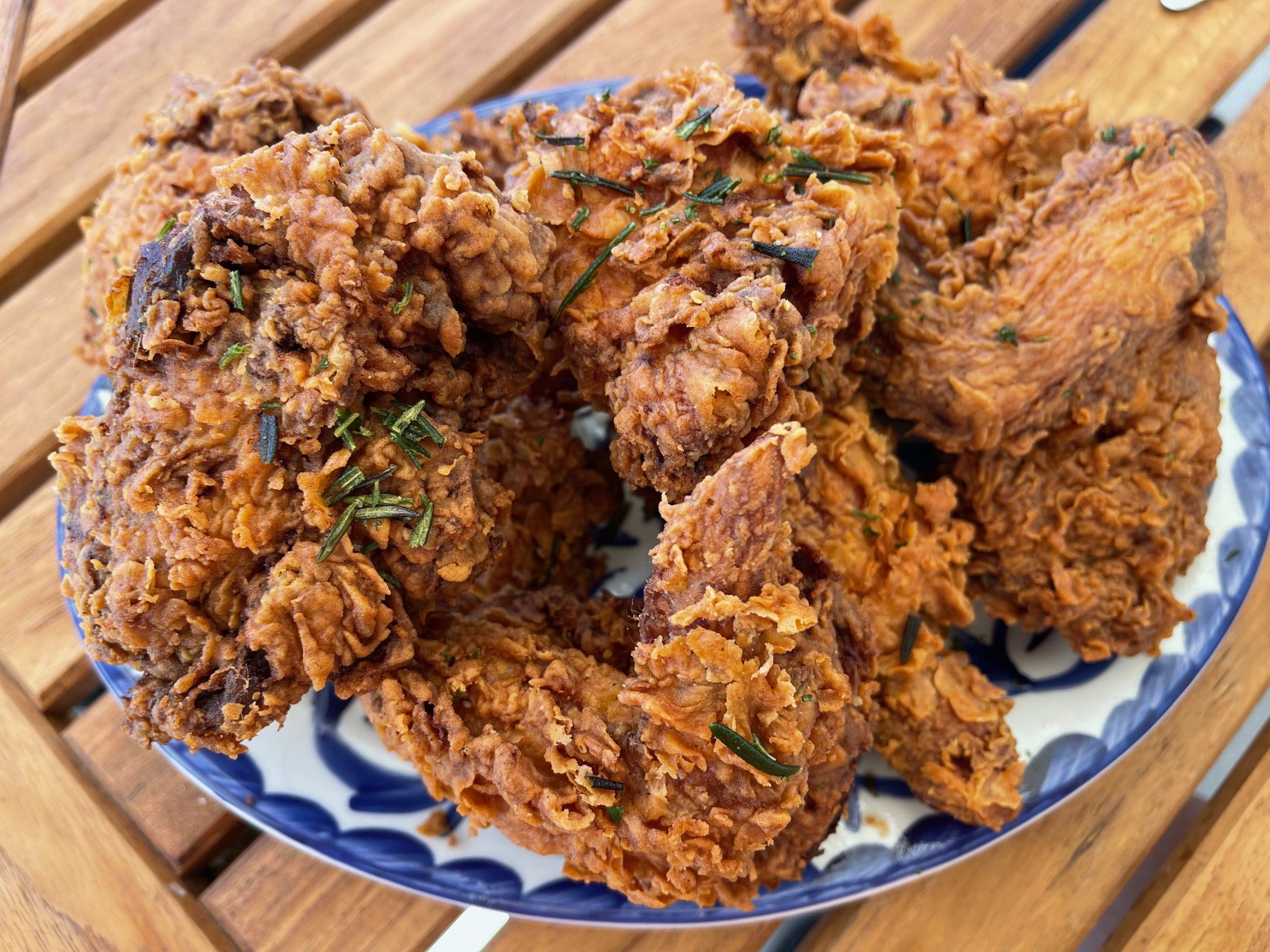 13 May 2022: In addition to ordering “buckets” of fried chicken, you can also order “a couple pieces.” Bucket aficionados will probably want to order one of two fixin’s options. You’ll have a heckuva time deciding which one to order. There’s green bean pickles, biscuits and jam OR mashers and gravy with coleslaw. Kentucky Fried Chicken may have made mashed potatoes and gravy with coleslaw practically de rigueur, but we certainly didn’t want any more associations with bucketed food we don’t like. Besides, the green bean pickles and biscuits and jam are terrific. Maybe the green bean pickles should be renamed pickled green beans because that’s what they are. They’re also superb with pronounced notes of cloves with their intense flavor and aroma. The biscuits and jam are also excellent though we didn’t get nearly enough raspberry jam. A pint or so would have been nice.