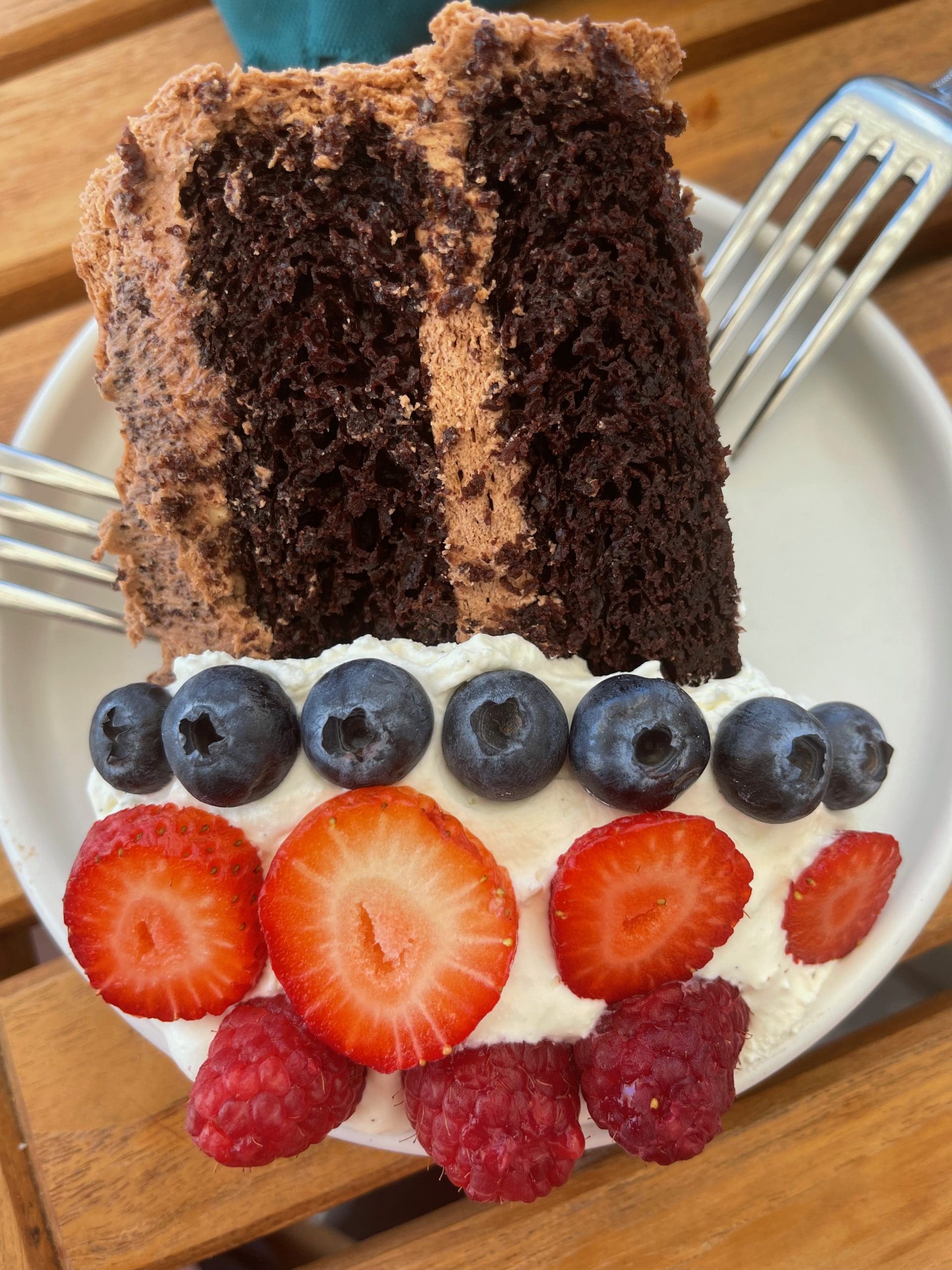 The other dessert options are cobbler (served hot or cold with a side of whip for a pittance), lemon tart and macerated berries and cream. By the way, with Mom’s chocolate birthday cake, a scoop of that luscious whip serves as a bed for a decorative array of blackberries, strawberries and raspberries. For me, that was the highlight of the dessert.