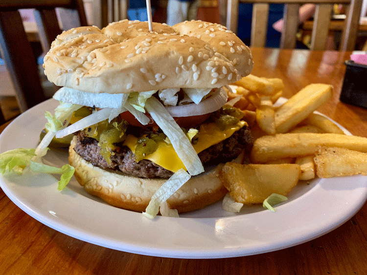 28 June 2019: There are eleven burgers on the menu, each one an invitation to enjoyment. All burgers are topped with lettuce, tomato onion and mustard. They’re hand-pressed and prepared to your exacting degree of doneness. The green chile cheeseburger is a picture-perfect exemplar of New Mexico’s most sacrosanct sandwich, and it takes two hands to handle this beefy behemoth between sesame seed buns. The beef is fresh and well seasoned, the green chile roasted and piquant. The steak fries are also prepared to order. They’re crispy on the outside and soft and tender inside.