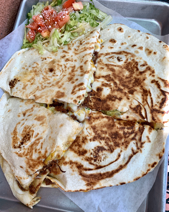 27 July 2019: Not knowing what to expect in terms of portion size, we ordered a quesadilla (two ten-inch tortillas with your choice of filling, cilantro, onion, salsa, crema and cheese) as an appetizer. Our choice of meat was the intriguing green chile brisket. It wasn’t the most aesthetically-pleasing quesadilla we’ve ever had, but for sheer delight and deliciousness, few quesadillas even come close. To put it mildly, the green chile brisket is spectacular–tender tendrils of shredded brisket infused with a smoky green chile of medium piquancy. My Kim enjoyed hers with crema while my choice was the chipotle salsa.