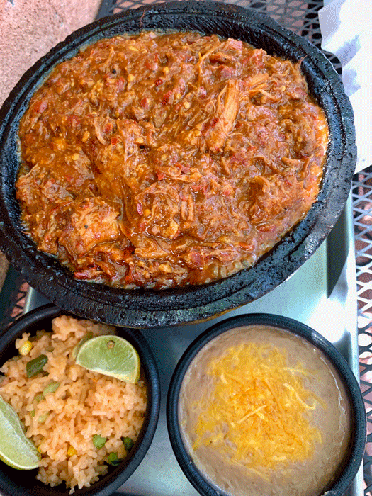 27 July 2019: Knowing we’d most certainly be taking much of our entree home, we shared a carne adovada molcajete (one-pound of homemade carne adovada served with twelve corn tortillas, cilantro, onions, salsa and a bowl of beans. A molcajete is essentially a seasoned stone mortar meticulously carved out of a single rock of vesicular basalt by a skilled artisan. Not only are they esthetic, they are highly functional, used for crushing and grinding spices and as serving vessels. That’s how Don Choche uses them. Our molcajete was brimming with carne adovada, shredded pork marinated in chile piquin. While most New Mexican carne adovada is relatively mild in terms of piquancy, this one bites like an angry wasp. We overfilled the fresh corn tortillas with the adovada, crafting terrific tacos. The accompanying beans and rice are both quite good, especially the refried beans which are much more soupy than refrieds tend to be.