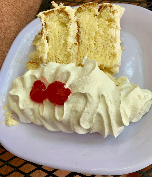 27 July 2019: There are several desserts on the menu–chocoflan, cherry or pineapple empanadas, cheesecake, churros, sopaipillas and honey and Kim’s favorite, pastel tres leches. Made with three types of milk (hence the name)–evaporated milk, sweetened condensed milk, and whole milk–this light and spongy cake is an absolute joy. Don Choche’s version is more lightly frosted than other versions we’ve ha in New Mexico, but a generous dollop of housemade whipped cream more than makes up for it. It goes without saying this cake is very moist and creamy. It’s also outstanding.