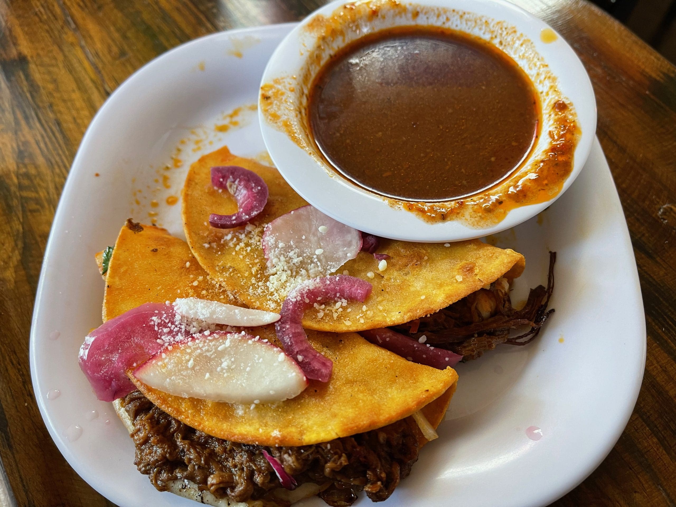 As the name implies, shrimp birria tacos combine fresh shrimp, moist birria and Chihuahua queso inside a corn tortilla envelope that’s been dipped in birria consommé. The shrimp are at the bottom of the corn tortilla envelope which means you’ll have to enjoy quite a bit of birria before you get to the shrimp (not that there’s anything wrong with that). Entire shrimp are used. They have a snap of freshness and blend beautifully with the birria. You might just leave Don Choche’s wondering if there’s anything the chef won’t try and that you won’t enjoy.