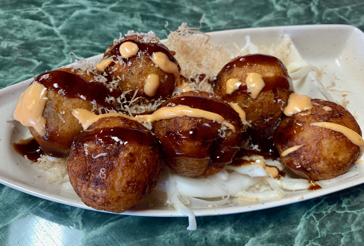 First to be delivered was takoyaki, six batter-fried orbs resembling donut holes, even onto the sauces drizzled on top. Served piping hot just out of the fryer, you may want to wait a couple of minutes before biting into them or risk burning the roof of your mouth. Bite into them and you’ll be pleasantly rewarded with a creamy amalgam of octopus, tempura, pickled ginger and green onion. Dried bonito flakes are sprinkled atop each takoyaki ball. Each orb is just about bite-sized if you stretch your mouth wide enough (or you’re a politician). If you’re wary that octopus may assault your taste buds with “fishiness,” fear not. The Iron Cafe’s octopus is fresh and delicious