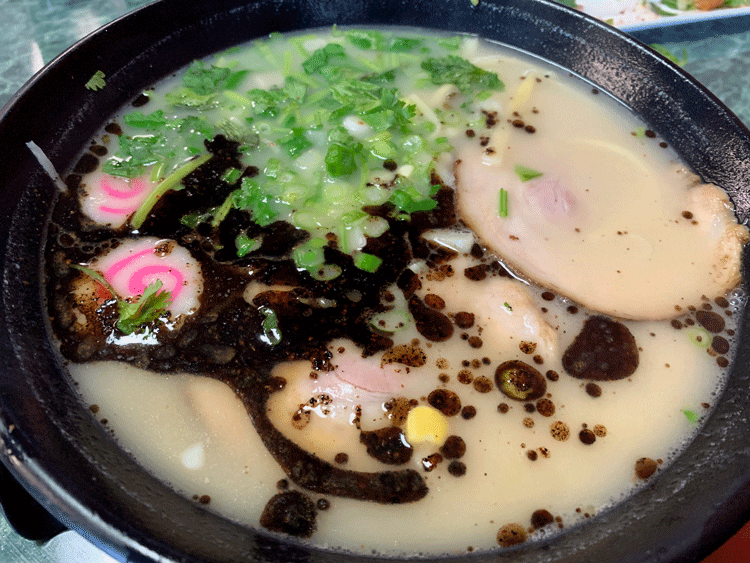 The terms “spicy” and “endorphin high” are not usually ascribed to tonkotsu ramen which, by its nature, is all about the rich, creamy, boiled pork broth and those squiggly, tender noodles, not about heat. Some ramen restaurants offer a spicy tonkotsu ramen option, sometimes with spice levels that range from “turn in your man card” to “you must be related to Chuck Norris.” I suspect Jonathan Gold visited one of LA’s Japanese restaurants which specialize in Tantanmen, a spicy ramen loosely based on Dan Dan Mian from the Sichuan province in China. The Iron Cafe, by the way, offers Dan Dan Noodles (with a spicy sauce showcasing chili oil and Sichuan pepper).