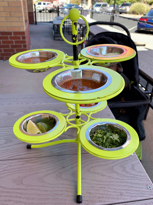A two-layer condiment caddy is provided with every food order. The caddy’s six separate steel containers are generously filled with cilantro, pico de gallo, tomatillo salsa, tatemada salsa, guaca crema and limes. If you scratched your head upon reading “tatemada,” you’re not the only one and it probably won’t be the first new term (not necessarily a Gil word) you’ll espy in this review. Salsa tatemada simply means charred salsa. Veggies are charred (grilled or roasted) before being chopped or pureed. It’s more important that you know it’s a delicious salsa with serious heat.