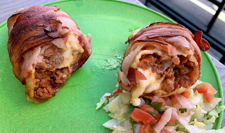 19 October 2019: If you enjoy reading Gil’s thrilling reviews because they come with a side of vocabulary, you should be doubly happy to learn there are no walls or borders to stop this lesson in lexicon. You’ve already learned about salsa tatemada. Your second new vocabulary word (as it was mine) is “momia,” a Mexican term for “mummy.” It makes good sense. A momia is a a burrito wrapped in bacon…and being wrapped in bacon is a fantasy most men secretly share. Choose from carne asada, al pastor, carnitas, chicken or shrimp as the filler for your burrito then fantasize about that bacon being wrapped around it. My first-ever momia was stuffed with al pastor, so this dish was doubly porcine–roasted, marinated pork inside and a smoky, salty bacon wrap. Where has this been all my life?