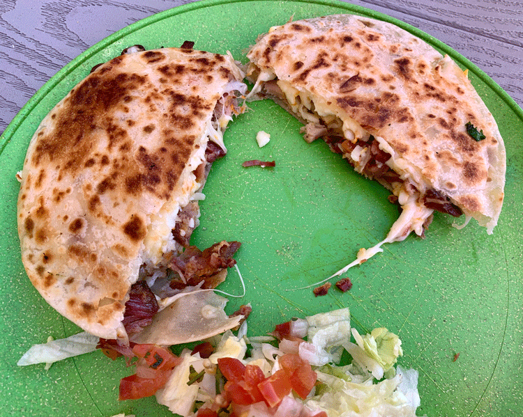 18 July 2020: Vampiros are neither taco, tostada or quesadilla, but a hybrid of all three in which a corn tortilla is toasted on the comal until firm (not crunchy or crispy) then topped with melted cheese and your protein of choice. Guaca Guaca serves its vampiros with pico de gallo and two salsas which you can apply as liberally or copiously as you want. My choice was carnitas, braised pork cut into small pieces. With a pinkish hue and a salty-sweet-smoky flavor, our initial impression was “this is ham,” but our server assured us it was not. Later research revealed smoked pork butt often seems to turn out rather “hammy.” Whatever the case, our first-ever vampiro was memorable.