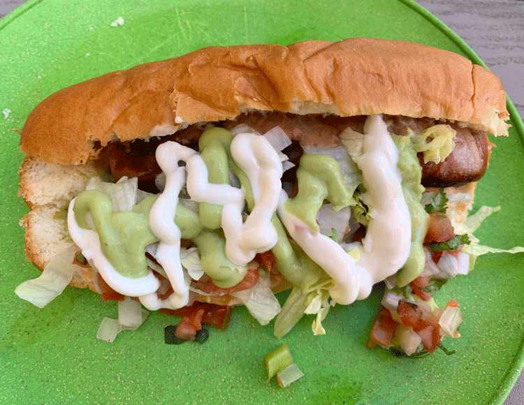 Both the Sonoran hot dog and the Guaca Guaca dog are messy, “everything but the kitchen sink” hot dogs some people will love and others won’t. For those of us who love creative, flavorful hot dogs with a pronounced smoky bacon influence, this one is sure to please. Thanks to the the richness of the guaca crema and the tanginess of the Mexican crema, you won’t miss mustard (or heaven forbid, ketchup). Nor is mustard necessary when you’ve got grilled onions. The hot dog is grilled until crispy before being nestled into a bolillo-type roll where it shares space with so many ingredients, they virtually spill over. The Guaca Guaca Dog is a terrific fusion of Mexican and American elements.