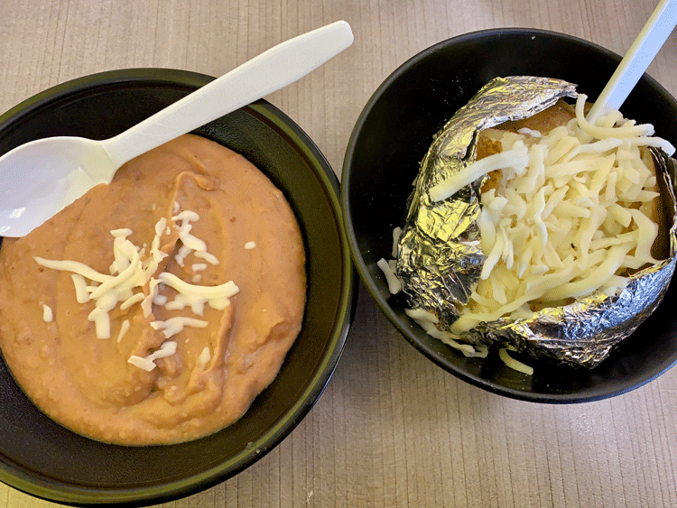 30 October 2019: Ferried over to our table next were refried beans with melted shredded cheese and a baked potato nestled in a foil jacket and sprinkled with a generous bounty of queso blanco. I’ve long contended that no one, not even the English pubs I frequented for years, make better baked potatoes than Mexicans. Though these were a bit on the smallish side, they were perfectly prepared–soft without being mushy, moist, lightly buttered with mild cheese. Though both Sr. Plata and I prefer baked potatoes the size of basketballs, we put more of a premium on flavor than we do on size. These were quite good. So were the refried beans even though they weren’t prepared in lard.