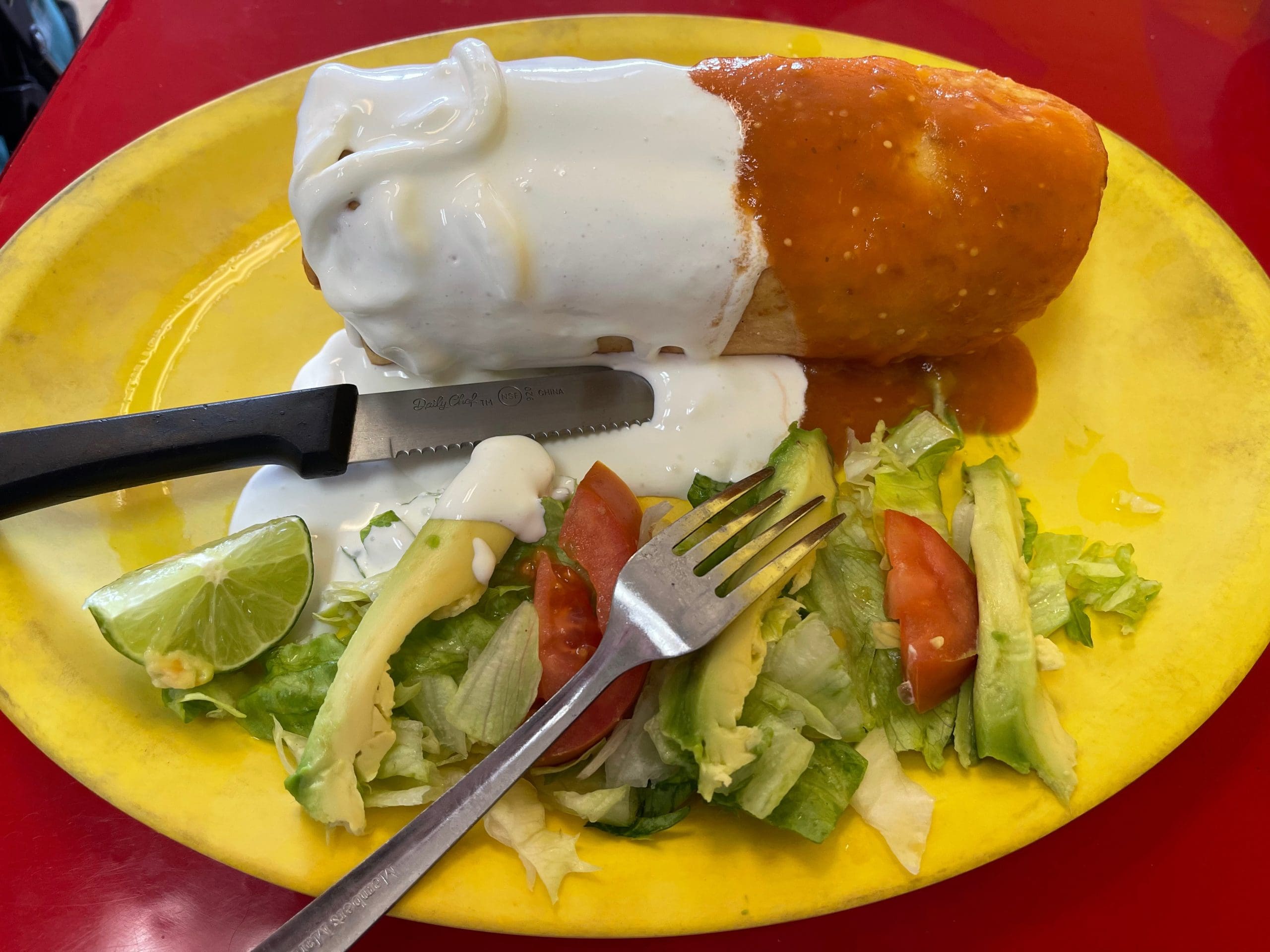 3 April 2022: For years my Kim has been hearing about the majestic pollo al carbon from the Albuquerque’s Five Points area which has increasingly become known as Little Mexico. After finishing some spring cleaning at home, we headed out late–much to our dismay. By the time we arrived at El Rey Del Pollo, all the pollo al carbon had sold out. Worse, the order being prepared was also accounted for, mostly by take-out orders. We would have to order something else. Most intriguing to us both was a chimichanga stuffed with the pollo asado of which we could not otherwise partake. We were so grateful there was enough of that pollo to stuff the chimichanga generously so my Kim could sample Sr. Plata’s favorite pollo. Half the chimichanga was topped with Mexican crema, the other half with a very mild red chile. Neither masked the char and deliciousness of the pollo. The flour tortilla was light and crispy, about as wonderfully done as any tortilla ever used to construct a chimichanga, a dish I’ve been overly critical of. El Rey Del Pollo has made a believer out of me.